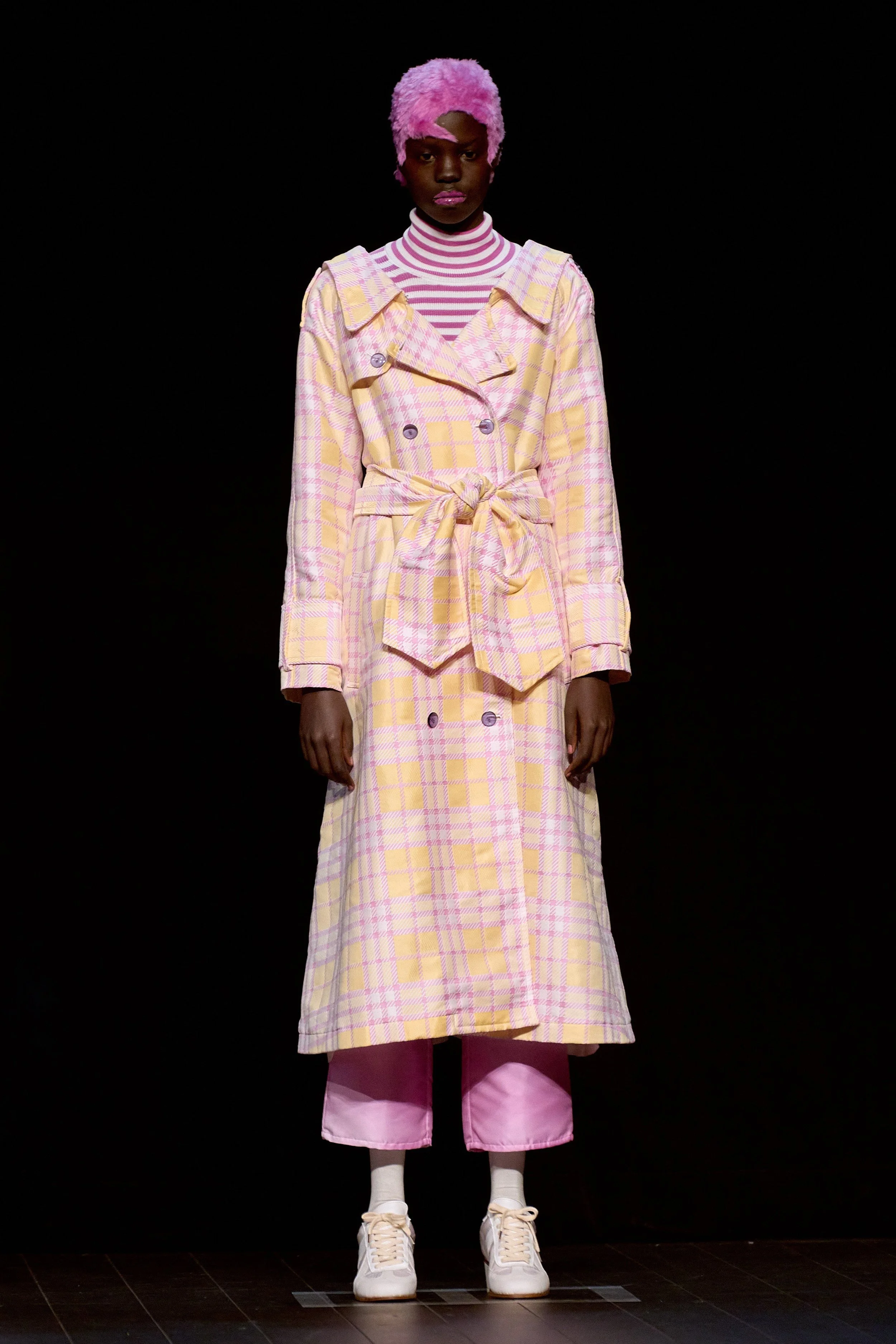 As models arrive on the stage wearing beautifully tailored coats two UV-emitting tubes were passed up and down the models and, as the light passed in front of the items of clothing, their pattern was revealed to the audience. The garments went through a transformation in front of the audience's very eyes. Seemingly, not everything was going to be as they had anticipated. The show raises questions on how we really interpret and perceive fashion, the clothes we wear and our relationship with them.