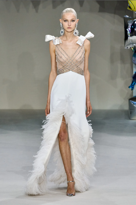 The show was extravagant, almost party-esque which was heightened by the balloon-based set decoration (admittedly, not a favourite amongst online fashion watchers). The collection is fun and flirty, starting with more timid straight line designs in neutral shades perfect for those who aren’t big risk-takers. Slowly but surely colour began to creep in in the forms of bows (a signature for Giambattista Valli) and feather accents.