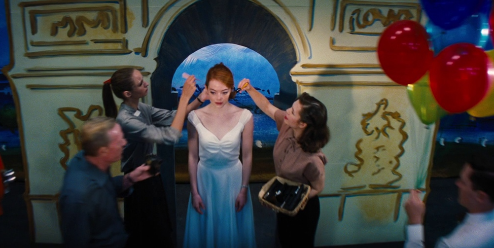 In that scene Hepburn’s character stands between the busy Parisian streets and the muddy ground around the Arc de Triomphe, she looks slightly lost during one of her first photoshoots and is handed a bunch of balloons, overwhelming the young model. Although blossoming in her new career the character has to get used to her new Parisian model life. In LaLaLand, Mia moves to Paris to finally find success as an actress, again Hepburn’s look is used to symbolise the American in Paris experience.
