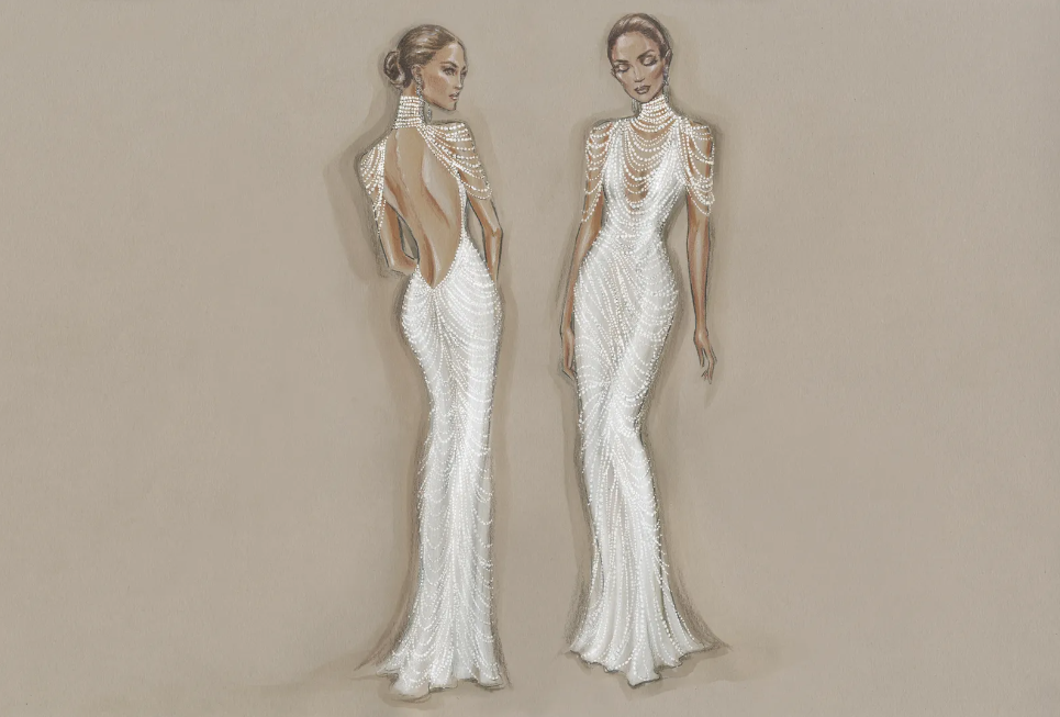 JLo has long had a relationship with Ralph Lauren, so wearing the designer for her very special day is not overly surprising. Her first gown, worn for the main ceremony, is perhaps the most extravagant of the looks. The dress, made using over 1,000 handkerchiefs and 500 metres of fabric, features an elegant turtleneck design with a delicately exposed back. The cascading ruffles, featured as a sort of mermaid skirt, elongate the wearer’s silhouette.