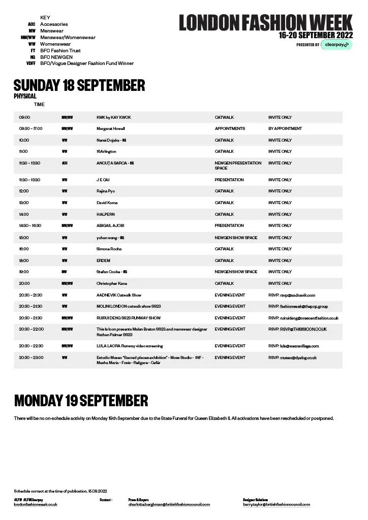 Highly unsurprisingly, all shows set to be held on the date of the Queen’s funeral on Monday the 19th have been cancelled with these being either cancelled or postponed to a later date. However, there is no need to worry because there will still be a vast amount of collections to gaze at and enjoy in the coming days including Chopova Lowena, Molly Goddard, Simone Rocha, Richard Quinn and so very many more.