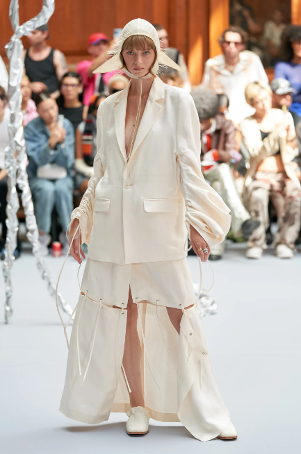The Holzweiler Spring 2023 collection, entitled In Motion, had mostly a white or cream colour palette but interspersed where shades of turquoise and bright greens which uplifted the entire show. Perhaps aided by the hot air balloons that were suspended above the runway catwalk. The use of crochet and drawstring only furthered this delightful aesthetic.