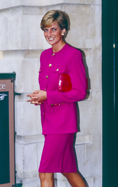 Marrying into the British Royal Family in 1981, Diana was thrust into the fashion limelight with everyone noting what she was, or wasn’t, wearing. This was the 1980s, *the* time of power dressing and Diana took to it like a moth to a flame. While figure-hugging and sleek cocktail dresses would replace her love of big ballgowns with oversized sleeves, Diana never quite shook off her ardent fondness for a blazer and straight/pencil skirt combo. During her marriage to Prince Charles, Diana was often seen wearing a tweed medley from Chanel, the look becoming a part of her image. There was a sense of formality yet softness that these outfits provided, matching her public personality. However, her relationship with the Parisian brand