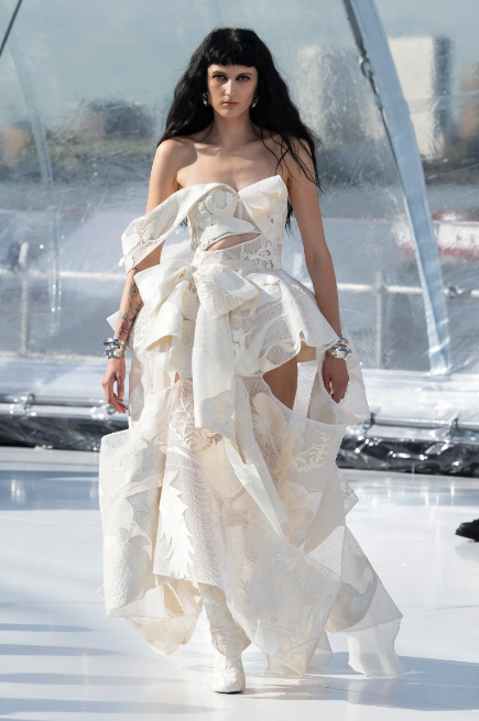 “Our clothes are designed to empower. They are stripped back, dissected and focused on cut, drape and silhouette. We also looked at the work of Hieronymus Bosch, at once dark and beautiful.” read the accompanying show notes. If there is one thing you can expect from Alexander McQueen, it's impeccable tailoring and Burton, after years spent with the late Lee McQueen, has cemented herself as one of the tailoring powers in the industry. There was not one look in the collection that felt out of place on the model, that looked too tight or too large (something Chanel could learn from after their recent show) and all pieces felt truly wearable. The final look, a white gown with a full skirt and adorned in thick nature-inspired embroidery could, on paper, seem rather extravagant and yet, it feels pared down, unfussy and characteristically McQueen.