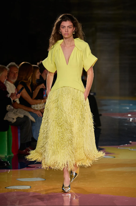 Not the hairstyle, the frilly bits of fabric that can sometimes find themselves attached to items of clothing. A fun way to add a bit of pizzazz to an outfit, we saw several brands add some swish with fringe. While some designers added fringe as the top note, Daniel Lee went all out at Bottega with a pale yellow dress with a full fringed skirt. Sticking with skirts, Jill Sander experimented with fringe in varying densities, from loose and free to cramped and packed.