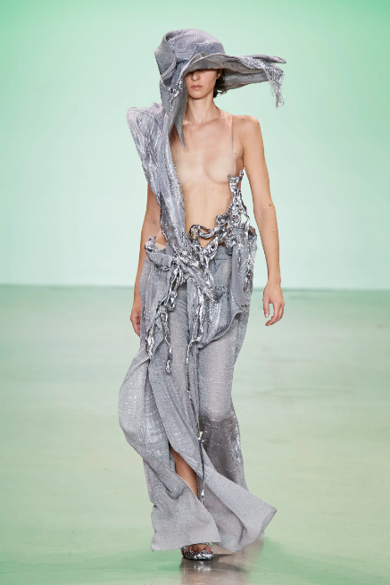Parsons MFA went down the same route as a few other designers in the past week at the beginning of their collection. The opening look, while it actually blocks the nipples with skin-toned pasties, uses the breasts as an anchor to the look, helping to focus the eye on the intricate garment.